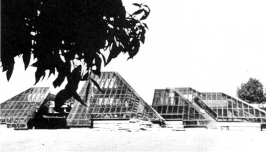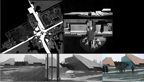 The importance of addressing the architectural organism composed of similarly shaped fundamental particles is reflected in the central part of the Memorial centre in Bosanski Šamac (Yugoslav anonymous architectural competition 1973, 1st prize and realization, 1980), which are fully glazed crystals in which the main public programs are placed. Crystals surround the citizens' vestibule, internal square and connecting foyer of theater and sports hall. Cultural centre is located on an artificial terrace above the plains along the river Sava and represents the core, as well as link between the old and new urban settlement.