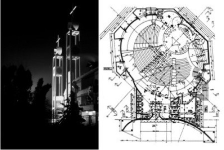The new church is a contemporary interpretation of a baroque ideal of the sacral buildings stressed with its elliptical nave and with a curved front stretched between the transparent bell-towers that invites prayers to enter the sanctuary. A special experience of this church are a sentiment of sacredness and mysterious daylight that enters through a high lantern and a ribbon that symbolically separates the nave from its roof. In the war the church was demolished and burnt-out but is being restored. [ ǀ ]