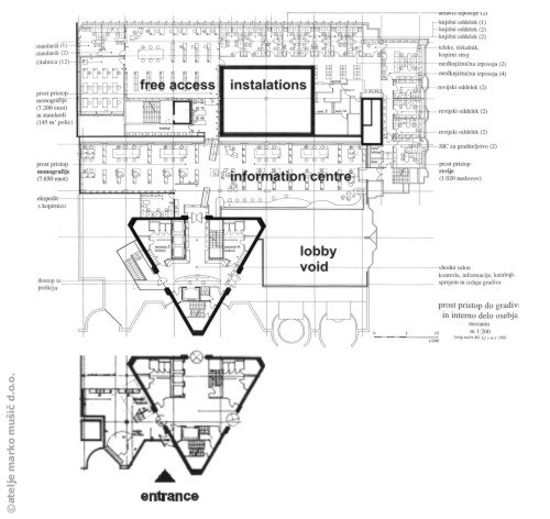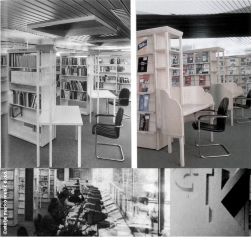 The Central Technological Library (CTK) is located on the premises of the TR3 building in Ljubljana, the famous composition of buildings by prominent Slovenian architect Edvard Ravnikar. The project includes organization of a separate entrance for the library, which allows users and staff the independence from other programs and events in the tower. The ground floor comprises the entrance foyer, with accompanying communications and cloakroom. In the mezzanine entry lounge with a large information and a rental counter, free access to monographs and journals, newspaper reading room, interlibrary loans, specialized units, a quiet reading room, eight study rooms, etc.. are placed. Interesting is the constant visual contact with the multi-level foyer of the tower, which is enabled by the extensive glazing by the long desk for users located in the information centre. A part of the project was also establishing closed warehouse for library units. On the 2nd floor the administration and internal work spaces for staff are located. Speciality is in our vicinity little known and rare, if ever seen in the architecture of libraries / public buildings, the use from natural wood in bright, warm colors such as white stained maple, which bring calmness, dignity and adequate illumination of spaces deprived of daylight. Another peculiarity is careful placement of long counters, large numbers of reading places and materials in free access monographs and journals areas, and many, specially developed details which enable efficient use of library units, for example magazine racks with pull-out elements, the individual reading points situated within the bookshelves (for browsing) and many others. Placement of a complex public library programe presented constan exploration of dialogue with outstanding architecture of prof. Ravnikar, presentations and respect of his central architectural thought and protection of many for this building characteristic materials and details, of course by enabling the organization of the investor's enormous expected units capacity, reading places capacity and high number of visitors. [ ǀ ]
