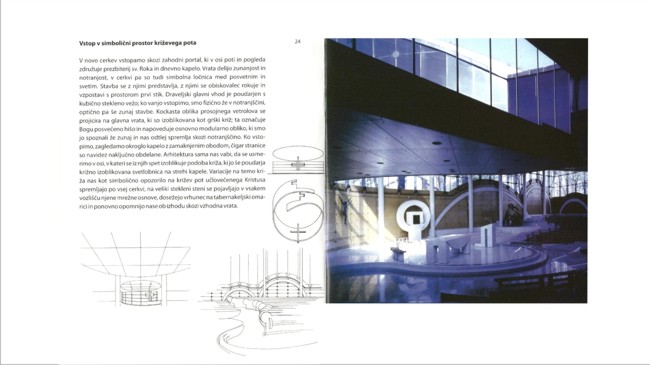 ...In 1985 the new church celebrating Christ's Incarnation was consecrated in Dravlje, a former village in the environs of Ljubljana that has today become a district in the northern part of the city. This is one of the most beautiful examples of modern church architecture in the world. It was commissioned by the Jesuit order and designed by the architect Marko Mušič. He managed to create a lasting work of art, the solutions of which continually inspire awe in worshippers, laymen and professionals alike. The new church has organically grown into the environment and unobtrusively combines its architectural and urbanistic heritage with its modern character. Its author treats his profession with all moral responsibility and envisages the architectural mission as an integral creative experience, a historical, anthropological, psychological, social and styilistic deliberation. It is down to him that the church in Dravlje is humanised: he has given it a new quality, brought it closer to man, to his state of emotions and the way he experiences the holy space, all of which suit the requirements of modern times.