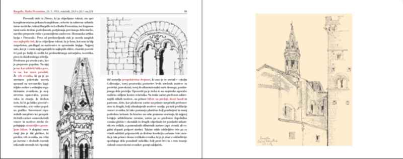 Posebno poglavje eseja je seveda posvečeno ponovnem srečanju s Firenco ali s Florenco, kot v eseju naslavlja »ponosno mesto sredi rajskih gričev, rojstni kraj renesance in humanizma, ki sta odprla poglede v bodočnost«. Kot lahko razbiramo iz izjemno lepega besedila, je Marjan Mušič najprej odšel v tišino firenške stolnice, od tam arhitekturna študija »firenška stolnica z Brunelleschijevo kupolo – pogled z zadnje strani«, in v mračno kapelo k pretresljivo lepi kompoziciji velikega Michelangela. V povzetku oznake Michelangelovega Snemanja s križa v florentinski stolnici zapiše: »Krog Michelangelove drame je zaključen: tam mladostno kipeči David, ki izzivalno kliče Usodo na boj, tu krik grenkih spoznanj, ki se gubi v spokojnost.« Risba Snemanje s križa bo z mojstrstvom in pretresljivostjo nedvomno prevzela marsikaterega arhitekta in ga opomnila, da so razsežnosti horizontov, iz katerih raste in kamor sega naš poklic, mnogo večje, kot se v sponah rutinskega vsakdanjega dela premalokrat zavedamo. ...