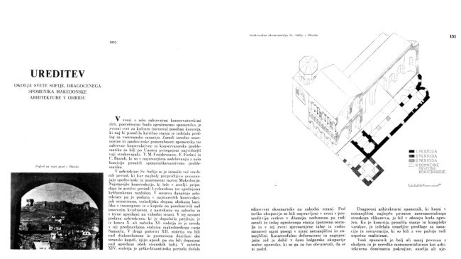 In the book, Architecture and Time (1963) Marjan Mušič published his own selection of the most important discussions and articles, which he arranged into three significant, important and meaningful chapters: Evaluation of sources (I) Keeping up the tradition (II) and Examples and initiatives (III). If there are reflections on Slovenian vernacular art in the first chapter, the architecture of a hayrack, a monument of Slovenian folk creativity, about wood in Slovenian vernacular architecture, about the structured editing of Slovenian villages or about influential areas between stylistic architecture and Slovenian folk architecture in the Middle Ages, in the second chapter a number of prominent themes and controversial points are presented, in which he himself participated. Among them the restoration of Euphrasios basilica in Poreč, problems of reconstruction and regeneration of Peristile Diocletian's Palace in Split, renewals in Novo Mesto in relation to the regeneration of historic city centers, renovation of the castle Otočec and restoration of the church of St. Sophia in Ohrid. In the third part he published a selection of records on important architects. Among them are Michelozzo di Bartolomeo, Sinan and Leonardo as well as Jože Plečnik, Max Fabiani, Ivan Vurnik and Edo Ravnikar.