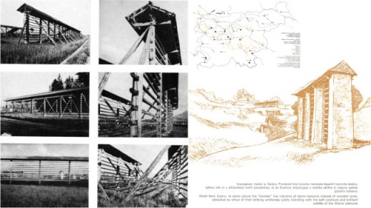 As a result of profound recognition of the unique phenomenon and the importance of our unique connection of Slovenian peoples' way of building, which Marjan Mušič dedicated himself to with special attention, devotion and love from the beginning of his professional practice, became a beautiful, unique, long unsurpassed monograph The architecture of Slovene "kozolec" (hay-rack), 1970. There he wrote the famous introductory thought: "In its clear structure, the "Kozolec" - the hay-rack- stands vigorously, a monument to the Slovenian peoples' way of building. Its architecture arises from the harmony of function and structure, convincingly achieved in the span of time, place and construction. ...As a consequence of this profound understanding, its archaism raised iself into timelessness" and more "Now, the function of a hay-rack is not only essential to the farming economy but, through it, to life itself. Hence, it has some almost sacral character..." He concluded, as was rightley acknowledged by academician Emilijan Cevc, that there is some kind of primordial architecture that works almost with magical power and shows peoples' creative efforts. The prophetic thought that the hay-rack involved in the efforts of finding an expression of new Slovenian architecture was much closer in the time when he wrote it, the state of exemplary classical modernism of the Ljubljana School with Ravnikar and later Sever, Mihelič, Kristl and Jugovec, than in times of mediocrity of today's uncritical clutching for global terminology that flushes our, with effort filled and over time acquired (established), identity and unfortunately moving away from it. The book is also exemplary and exceptional in design and technical arrangements executed by the architect Jože Brumen.