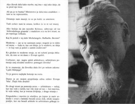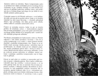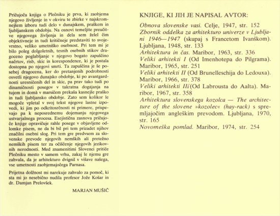 After a profound exploring and his own experiences and close, friendly relationship with his teacher and role model, after a series of discussions and articles, lectures, rationale and descriptions of his art but also with conflicts and resentments, which he received when he stood up for the promotion of the master's personality and work in post-war climate of hatred and devaluation, Marjan Mušič wrote a book on Plečnik, which was firstly published in 1980 in a collection titled Famous Slovenians. The book consists of basic knowledge about origins, characteristics, uniqueness, meaning and mission of our architectural genius who became as the years and decades passed, increasingly alive and current and interpreted in various ways and reinterpreted in a variety of formats, occasional, professional or amateur, as well as by the most specialized researchers of the work and life of Jože Plečnik. In the famous book already published in 1986 precise labels that are short and up to the point and allow a wide derivation and other clues for subsequent researches. The book is deficient in graphic material and depends almost entirely on the depth and density of the text and basic thoughts making the need for graphics unnecessary. Therefore a book, such as architects, let alone other writers on architecture, mostly do not know, do not recognize and can not do.
