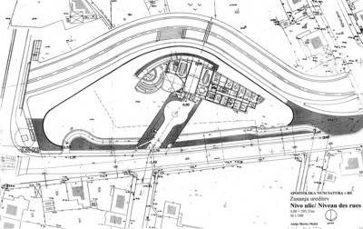 The characteristic of the winning competition project is the idea of villa urbana, of a town villa in the green surroundings of the southern front of the Ljubljana historical core. The main, southern elevation follows the flow of the small river Gradaščica. The building is located in the park on the lower bank terrace by the water and is connected with town streets by an elevated bridge. The central accent of the otherwise horizontal and into greenery placed architecture is the chapel orientated towards the neighbouring church in Trnovo. [ ǀ ]