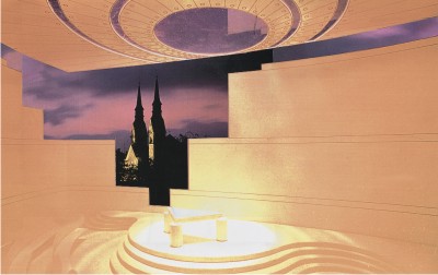Značilnost na natečaju izbranega projekta je zamisel mestne vile v zeleni parkovni obrobi južnega pročelja ljubljanskega zgodovinskega središča. Glavna, južna fasada sledi obrežju rečice Gradaščice, stavba v zelenju na nižji terasi ob vodi pa je z mestnimi ulicami povezana s privzdignjenim mostom. Osrednji poudarek sicer horizontalno zleknjene in v zelenje vraščene arhitekture je kapela, ki je usmerjena proti bližnji trnovski cerkvi.