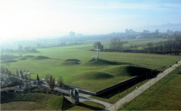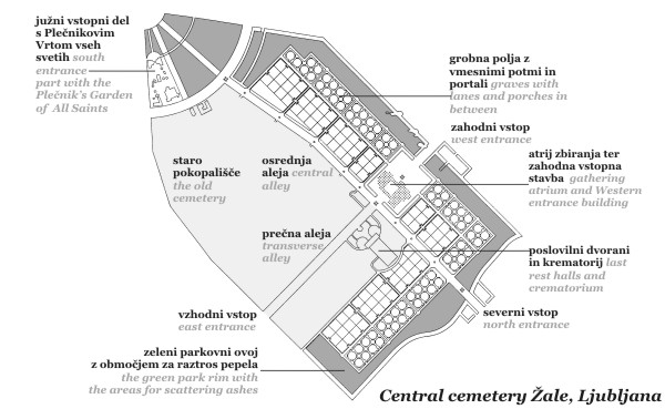In respect of the importance of the relationship between the metropolis and its necropolis the city of dead is designed on the antiquity ideal. Paths with trees that give them their names run between the burial fields on which the views are discreetly veiled with green trims. In contrast, the view from slightly higher burial fields open in vast surroundings and prevent the feeling of closure. The architecture of the cemetery is completed by numerous motifs of entrances, pavilions, memorials and other contents continuing the culture of individual and carefully designed details superbly established by architect Jože Plečnik. In the newer part of the cemetery entrance portals stand out. They are particularly enriched with verses from contemporary Slovenian poets. The central unifying motif of the newer part of the cemetery is the pavilion with the passing-beell (“navček”). The new part of central cemetery is surrounded by an elevated park with created hills, tumuli, a memory of graves of antique inhabitants of our land. The park is also the ashes scattering area. The crown of the city of the dead is marked by a cross with the altar at the top of an artificial hill that visually connects the old and the new part of Ljubljana central cemetery Žale.
