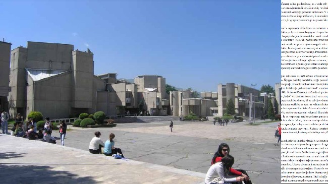 The Ss. Cyril and Methodius University Centre in Skopje consists of Philosophical, Legal and Economy faculties. Within the complex is the Rector's office, but the main spatial and content core consists of the buildings of the three faculties. External forms themselves provide clear visibility of their content, clearly expressed by itheir shape. The entrances to the building faculties are recognized by the impressive designed staircases with trembling shadows and light that create a subtle wreath around the agora. This expands to the amphitheatres with their spatial dimension and symbolic conclusions, between them horizontally stretched entry vestibules, the longitudinaly designed rooms intended for educational and scientific activities, and the perpendicular wings for academic staff.