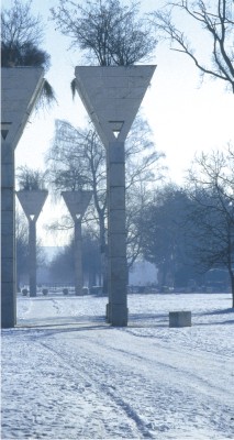 "Green torches", as the large porches are commonly referred as, present a central, distinctive and unique architectural element that visually connects the space of the whole wide arreal. On one hand they mark intersections of the Cardo and Decumanus of the Ljubljana's central cemetery. On the other hand, the tall pillars with eternally flaring green tops are like sparks in the flame of eternal fire.